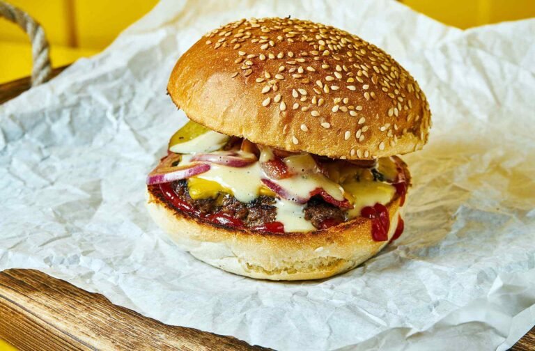100 % Grass-fed beef patty, cheddar cheese, special sauce, tomato, pickles, lettuce, sesame seed bun
